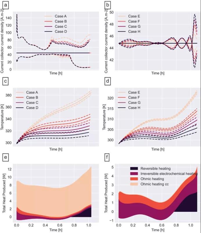 圖2 電池運(yùn)行過(guò)程中果凍卷芯內(nèi)部的電流密度和溫度分布。(a-d)中不同冷卻系數(shù)情況下以虛線(xiàn)表示最小/最大值,以實(shí)線(xiàn)表示平均值。左側(cè)為標(biāo)準(zhǔn)極耳設(shè)計(jì)結(jié)果,右側(cè)為無(wú)極耳設(shè)計(jì)的結(jié)果。對(duì)于標(biāo)準(zhǔn)極耳設(shè)計(jì)(圖e)和無(wú)極耳設(shè)計(jì)(圖f),顯示了示例A和E中各因素對(duì)熱源的影響