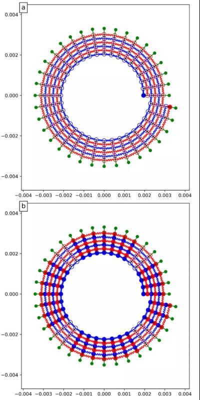 圖1 (a)標(biāo)準(zhǔn)極耳設(shè)計(jì)和(b)“無(wú)極耳”設(shè)計(jì)的計(jì)算域。藍(lán)色代表負(fù)極集流體,紅色為正極集流體,綠色代表外殼的熱邊界