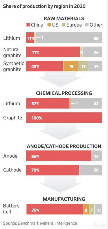 研究機(jī)構(gòu)Benchmark Mineral Intelligence公布的數(shù)據(jù)顯示,全球鋰電池原材料中,70%以上都來(lái)源于中國(guó),來(lái)自歐洲、美國(guó)兩個(gè)地區(qū)的原材料甚少。