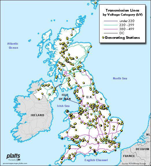 目前英國(guó)國(guó)家電網(wǎng)系統(tǒng)包含約7200公里的架空線、1400公里的地下電纜和約330個(gè)變電站。在英格蘭和威爾士有高壓輸電系統(tǒng),系統(tǒng)電壓為275kV和400kV。擁有2000MW英法輸電系統(tǒng)、1000MW BritNed英荷輸電系統(tǒng)兩條典型HVDC線路。