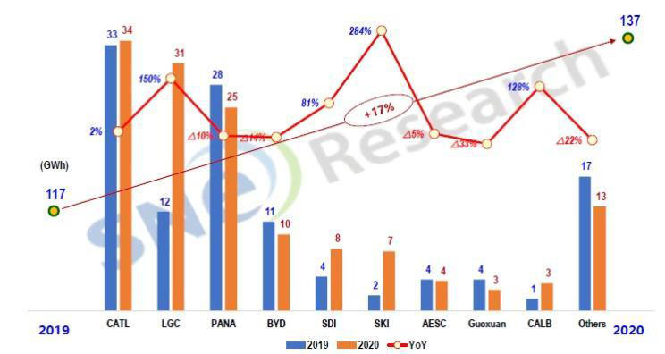 中國(guó)儲(chǔ)能網(wǎng)訊:日前,據(jù)韓國(guó)研究機(jī)構(gòu)SNE Research公布的2020年全球動(dòng)力電池裝機(jī)量數(shù)據(jù)顯示,2020年全球動(dòng)力電池總裝機(jī)量達(dá)137GWh,同比增長(zhǎng)17%。其中,寧德時(shí)代以34GWh的裝機(jī)量再一次奪得冠軍,這也是寧德時(shí)代連續(xù)第四年裝機(jī)量登頂。