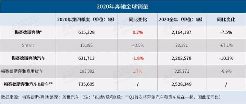 梅賽德斯奔馳汽車部門2020年累計共售出2,202,578 輛汽車,同比下降10.3%;電動車的銷量幾乎翻了兩番,超過11.5萬輛,銷量占比從2019年的2%上升至7.4%。其中,EQC的全球銷量大約為2萬輛;EQV 的銷量在1,700輛左右;純電動smart車型的銷量約27,000輛,較2019年同比大漲45.6%。