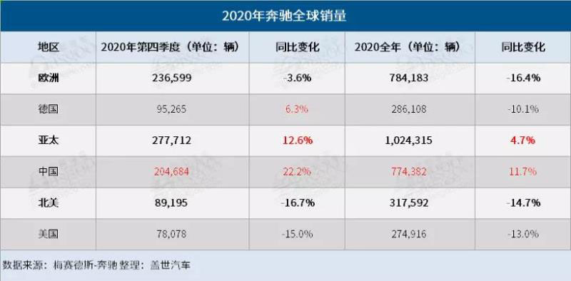 奔馳全年銷量受益于下半年許多市場的持續(xù)復(fù)蘇。其中在亞太地區(qū),奔馳共售出1,024,315輛汽車,同比增長4.7%;中國依然是奔馳該地區(qū)銷量增長的主要推動力,因市場的快速復(fù)蘇,奔馳2020年在華售出創(chuàng)紀(jì)錄的774,382 輛汽車,實現(xiàn)兩位數(shù)增幅(11.7%)。在歐洲地區(qū),奔馳累計售出784,183輛汽車,同比下跌16.4%;其中在德國,奔馳銷量同比下降10.1%至286,108輛。在北美地區(qū),奔馳累計售出317,592輛汽車,同比下降14.7%,其中在美國地區(qū)銷量同比下降13%至 274,916 輛??傮w而言,奔馳最大市場是中國、德國和美國,其次是英國和韓國。