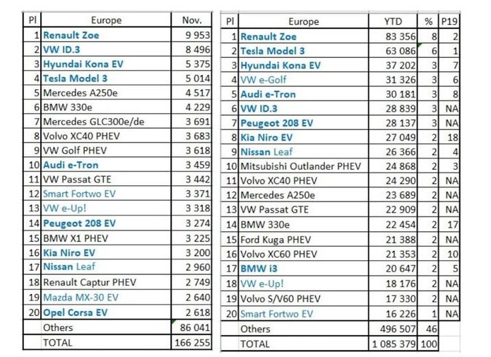 11月,雷諾Zoe、大眾ID.3、現(xiàn)代Kona、特斯拉Model 3、奔馳A級(jí)250占據(jù)了歐洲電動(dòng)車銷量榜單的前五名,銷量分別是9953臺(tái)、8496臺(tái)、5375臺(tái)、5014臺(tái)、4517臺(tái)。