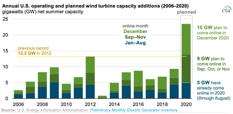 美國(guó)對(duì)可再生能源的生產(chǎn)稅抵免(PTC)優(yōu)惠在2020年底起逐步取消,這將導(dǎo)致今年的新增風(fēng)電超過平均水平。根據(jù)美國(guó)能源信息署(EIA)收集的數(shù)據(jù),預(yù)計(jì)2020年美國(guó)有超過23吉瓦(GW)的風(fēng)力渦輪機(jī)發(fā)電容量并網(wǎng),這遠(yuǎn)遠(yuǎn)超過了此前2012年創(chuàng)下的13.2 吉瓦的記錄。今年前8個(gè)月只有5.0GW的容量并網(wǎng),其余18.5GW計(jì)劃在9月至12月并網(wǎng)。在過去的10年中,每年增加的風(fēng)電裝機(jī)量的41%在12月并網(wǎng)。