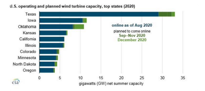 從各州來(lái)看,得克薩斯州的風(fēng)電裝機(jī)容量最大,截至2020年8月已安裝29.1吉瓦。德克薩斯州的項(xiàng)目開(kāi)發(fā)人員預(yù)計(jì)到今年年底將再增加4.0吉瓦。項(xiàng)目開(kāi)發(fā)商計(jì)劃在俄克拉荷馬州增加2.7吉瓦的裝機(jī)容量,將該州的風(fēng)電容量從8.2吉瓦增加到10.9吉瓦。