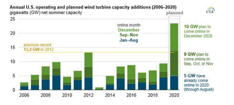 中國(guó)儲(chǔ)能網(wǎng)訊:根據(jù)美國(guó)能源信息署(EIA)收集的數(shù)據(jù), 2020年,預(yù)計(jì)美國(guó)將新增風(fēng)機(jī)裝機(jī)容量超過(guò)23吉瓦,遠(yuǎn)遠(yuǎn)超過(guò)2012年創(chuàng)下的13.2吉瓦水平。