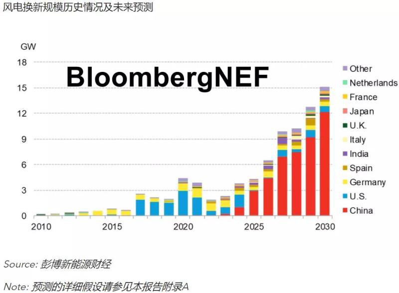 換新包括場內(nèi)風(fēng)機(jī)部件升級改造或完全換新。美國和德國的換新市場發(fā)展強(qiáng)勁,到2024年,換新規(guī)模預(yù)計增至近12GW。此后,中國風(fēng)機(jī)提前退役將再次掀起換新潮。