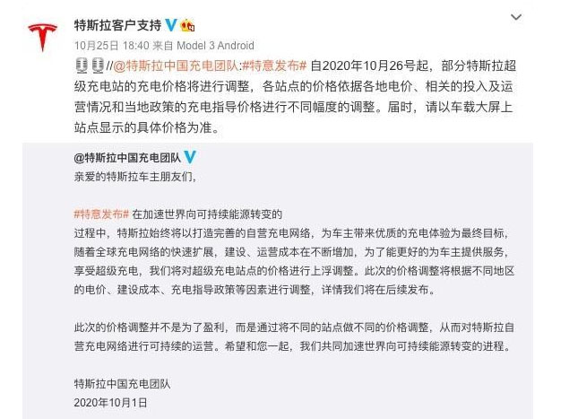 據(jù)@特斯拉客戶(hù)支持 官方微博消息,自 2020年10月26號(hào)起,部分特斯拉超級(jí)充電站的充電價(jià)格將進(jìn)行調(diào)整。