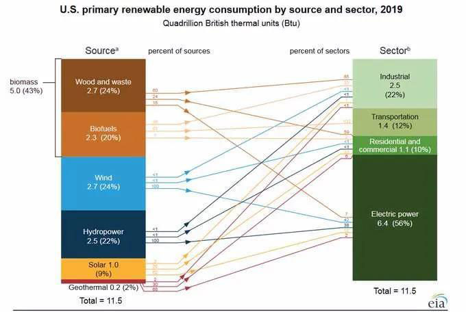 各國(guó)的可再生能源統(tǒng)計(jì)一般都是從供應(yīng)的角度出發(fā),描述不同來(lái)源的可再生能源的供應(yīng)量。根據(jù)美國(guó)能源信息署的數(shù)據(jù),2019年,美國(guó)可再生能源供應(yīng)為11.5夸特(Quadrillion BTU,10的15次方英熱單位),其中木柴和廢棄物占24%、生物燃料占20%、風(fēng)電占24%、水電占22%、太陽(yáng)能占9%、地?zé)嵴?.2%。