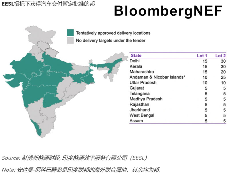 EESL已初步公布了招標(biāo)名單,包括接受新能源汽車的邦及各邦的采購(gòu)量。德里和喀拉拉邦的采購(gòu)數(shù)量最大,各為45輛,其次是馬哈拉施特拉邦和安達(dá)曼與尼科巴群島。招標(biāo)沒有明確規(guī)定交付時(shí)間。在可能接受交付的各邦里,中央邦、北方邦和德里已經(jīng)設(shè)下了政府車輛100%電動(dòng)化的目標(biāo)。