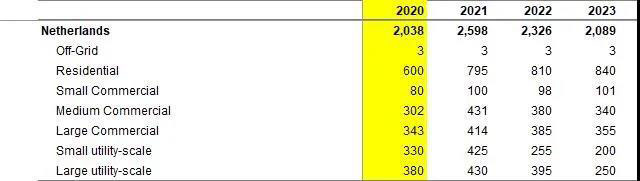 荷蘭市場上半年的表現(xiàn)比較穩(wěn)定,根據(jù)分析機(jī)構(gòu)預(yù)測,2020年荷蘭將持續(xù)新增光伏裝機(jī)2.02GW,其中屋頂系統(tǒng)占比最大,約為600MW,工商業(yè)分布式和公共事業(yè)項目將新增1.35GW。