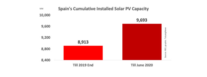 西班牙電網(wǎng)公司在今年7月份發(fā)布公告,盡管該國經(jīng)濟(jì)受疫情打擊嚴(yán)重,但上半年新增了780MW的光伏和446MW的風(fēng)力發(fā)電。其中光伏的新增裝機(jī)主要得益于西班牙Iberdrola公司的500MW太陽能發(fā)電項目的上線。根據(jù)2020年上半年的數(shù)據(jù),截6月底,西班牙累計太陽能光伏裝機(jī)容量達(dá)到9.693 GW。