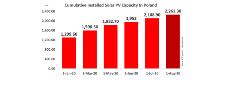 波蘭電網(wǎng)PSE的數(shù)據(jù)顯示,到2020年8月1日,波蘭的累計安裝和并網(wǎng)太陽能光伏發(fā)電量達(dá)到2,261.347 MW。其中,前六個月新增光伏809MW。七月份安裝了超過152MW的光伏,波蘭可再生能源研究所(IEO)表示,該國到2020年底可達(dá)到2.5 GW的累計裝機(jī)容量,到2025年,這一數(shù)據(jù)有望增至7.8 GW。