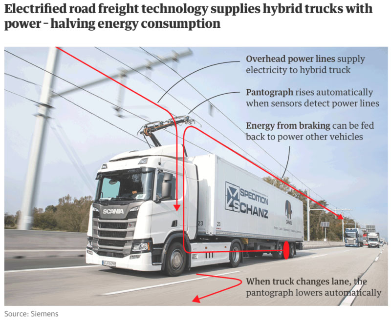 針對這一問題,英國可持續(xù)道路貨運中心(Centre for Sustainable road Freight)報告建議,通過建設(shè)全國“電子高速公路”(e-highways),為電動卡車安裝架空充電電纜。這些由國家電網(wǎng)供電的接觸網(wǎng)電纜將通過一個可伸縮裝置與行駛在7000公里英國公路內(nèi)側(cè)車道上的貨車相連,類似于電動火車頂部的索具。電纜的電力將為卡車的電動機提供動力,同時為車上的電池充電,使汽車能夠行駛在電氣化道路以外的目的地。西門子(Siemens)公司和卡車制造商Scania已經(jīng)在德國、瑞典和美國對e-highway電動道路系統(tǒng)進行了廣泛的測試。