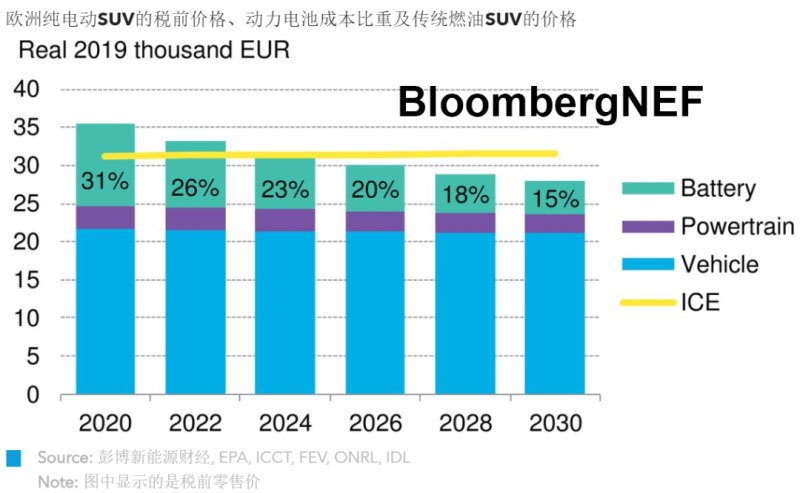 歐洲大型汽車市場(chǎng)和美國SUV市場(chǎng)等車型價(jià)格較高的汽車細(xì)分市場(chǎng)中,我們預(yù)計(jì)新能源汽車和燃油車最早于2022年實(shí)現(xiàn)平價(jià)。到2023年至2024年,動(dòng)力電池占整車成本中的比重預(yù)計(jì)降至20%或以下,電動(dòng)馬達(dá)約占整車成本的8%到10%,純電動(dòng)力總成汽車整車成本與燃油車相近。