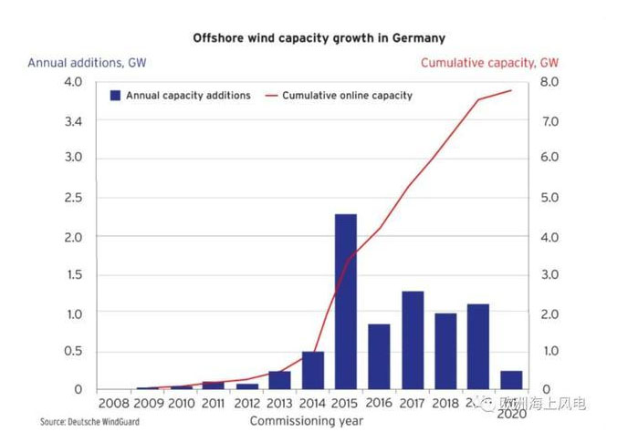 下一批將要并網(wǎng)的海上風(fēng)電場(chǎng)是在2017年和2018年招標(biāo)的,并網(wǎng)時(shí)間是2021年至2025年。而自2019年起,德國(guó)就沒(méi)有進(jìn)行過(guò)海上風(fēng)電招標(biāo)。