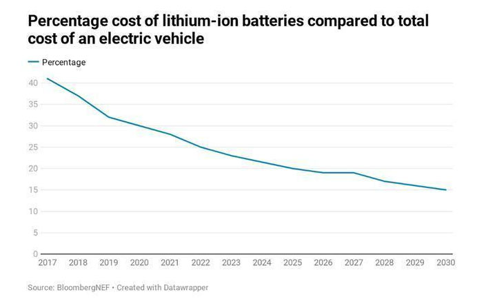 考慮到電池在汽車成本中所占的比例,電動汽車只比內(nèi)燃機車貴10%,而不是30%,這很容易在擁有電動車一到兩年的時間里重新獲得更便宜的運行成本。這也將使電動汽車比燃料電池技術(shù)有更大的領(lǐng)先優(yōu)勢,而氫能源則不大可能成為電動汽車的未來。