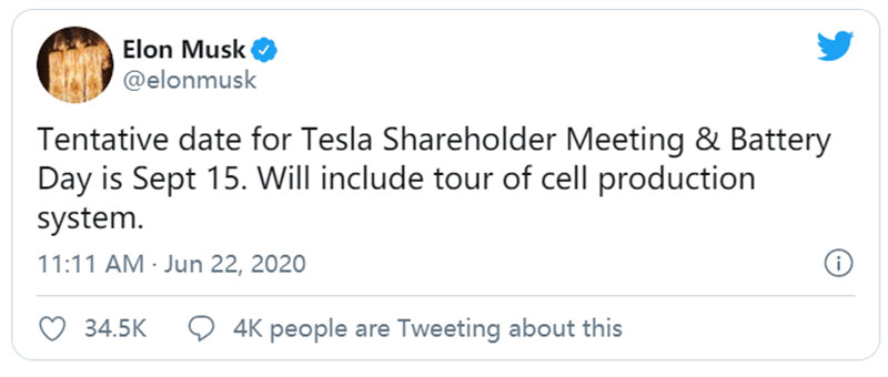 近日,特斯拉掌門人馬斯克發(fā)推文稱,特斯拉電池日和股東大會(huì)推遲至9月15日在加利福尼亞州弗里蒙特舉行,并且與會(huì)股東將參觀電池生產(chǎn)線。