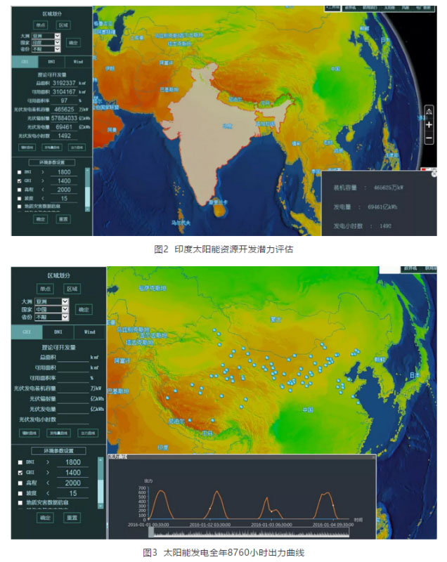 該系統歸集了全球風能10×10公里、測風高度70米、80米、100米的十年逐小時風能資源數據,以及太陽能4×4公里的十年平均太陽能輻射量數據,可實現對全球重點風光發(fā)電基地開發(fā)潛力和出力特性的評估,并基于三維GIS工具實現風光發(fā)電基地資源評估和出力特性的可視化展示。