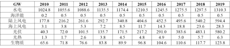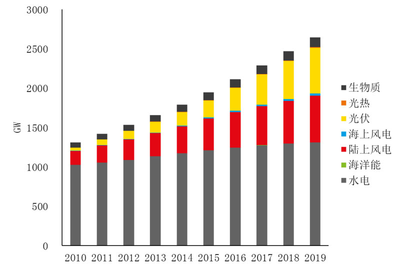 2019年,全球可再生電力裝機(jī)總量2644GW,其中水電1310GW,陸上風(fēng)電594GW,海上風(fēng)電28GW,光電580GW,光熱6.3GW,生物質(zhì)發(fā)電124GW,海洋發(fā)電0.5GW。