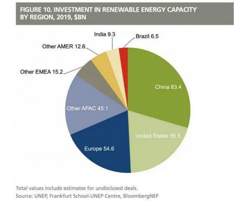 2019年的投資使不包括大型水電在內(nèi)的可再生能源在全球發(fā)電中的份額從2009年的5.9%上升到13.4%。彭博新能源財經(jīng)首席執(zhí)行官Jon Moore說:“清潔能源將在2020年處于十字路口。過去十年取得了巨大進(jìn)展,但2030年的官方目標(biāo)遠(yuǎn)遠(yuǎn)沒有解決氣候變化所需的目標(biāo)。當(dāng)前的危機(jī)緩解時,各國政府不僅需要在雄心勃勃的可再生能源上,而且還要在運(yùn)輸,建筑和工業(yè)的脫碳領(lǐng)域上加強(qiáng)措施與行動?!?