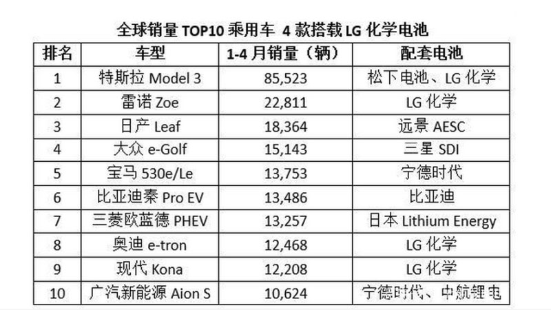 根據(jù)EVsales數(shù)據(jù),今年1-4月,全球銷量TOP10新能源乘用車車型中有4款車型都搭載了LG化學電池,占比最高。配套熱銷車型,動力電池裝機量自然也跟著快速增長。據(jù)電池中國網(wǎng)了解,僅銷量第一的特斯拉Model 3,今年1-4月就為LG化學貢獻了1.46GWh的動力電池裝機量。