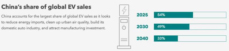 預(yù)計(jì)2025年中國(guó)占全球電動(dòng)車(chē)銷量的54%、2030年占49%、2040年占33%。