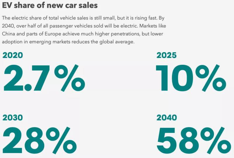 2020年電動(dòng)車(chē)占全球乘用汽車(chē)市場(chǎng)比例為2.7%,預(yù)計(jì)2025年占比10%、2030年占比28%、2040年占比58%。