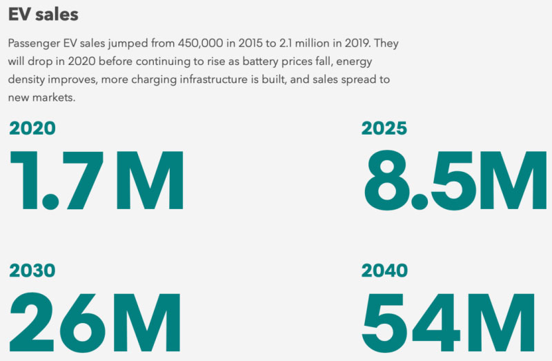 2020年受疫情影響,全球電動(dòng)車(chē)銷量將為170萬(wàn)輛,低于2019年的210萬(wàn)輛,但2021年以后市場(chǎng)反彈。預(yù)計(jì)到2025年銷量可達(dá)850萬(wàn)輛、2030年2600萬(wàn)輛、2040年5400萬(wàn)輛。