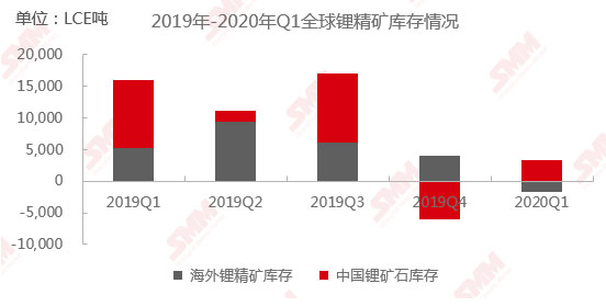 據(jù)計(jì)算,2020年第一季度全球鋰礦石庫存(LCE)新增1578噸,其中國內(nèi)庫存(LCE)新增為3343噸,海外鋰精礦去庫(LCE)1765噸。