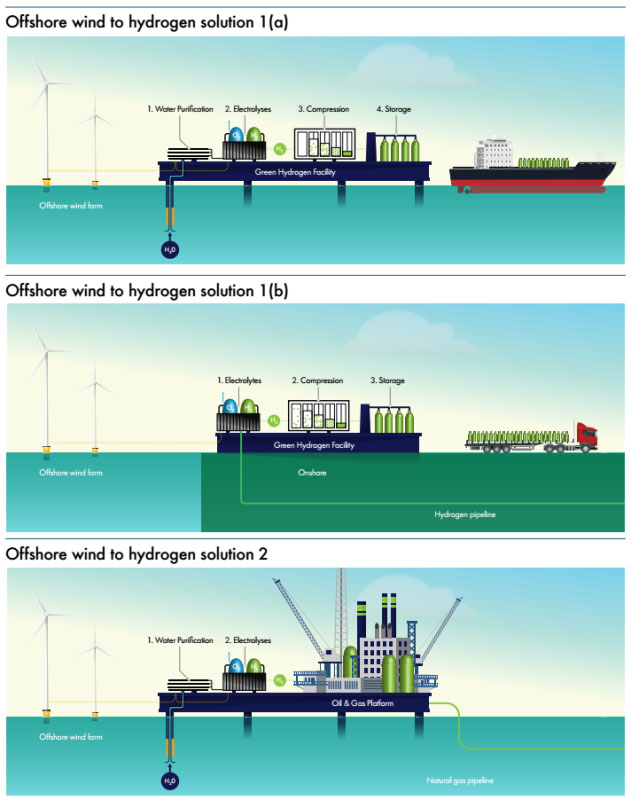 實現(xiàn)氣候目標(biāo)的關(guān)鍵是海上風(fēng)電制氫。在所有可再生能源制氫的選擇中,海上風(fēng)電最有潛力,它的規(guī)模和技術(shù)創(chuàng)新帶來了很強的經(jīng)濟競爭力,成本在過去幾年不斷下降。目前,被廣泛開發(fā)的海上風(fēng)電制氫解決方案有兩種,如下圖所示。第一種方案中,過剩的海上風(fēng)電將用來電解水產(chǎn)生氫氣和氧氣,氫氣被壓縮、存儲、轉(zhuǎn)運。如果有海上氫化平臺,還可以就地轉(zhuǎn)化為合成天然氣或氨?;?qū)㈦娊庋b置布置在岸上,氫氣直接通過管道或卡車運輸。另一種方案是將電解裝置布置在海上油氣平臺上,利用多余的海上風(fēng)電電解水制氫,然后將氫氣混進已有的天然氣管線進行運輸,預(yù)計天然氣中可以混入最多20%體積的氫氣。目前歐洲、澳大利亞已有不少綠氫項目正在規(guī)劃建設(shè)中。
