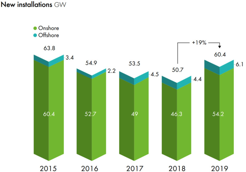 2019年全球新增風(fēng)電裝機容量為60.4GW,新增比2018年多19%,是歷史上新增第二多的年份,僅次于2015年新增的63.8GW。