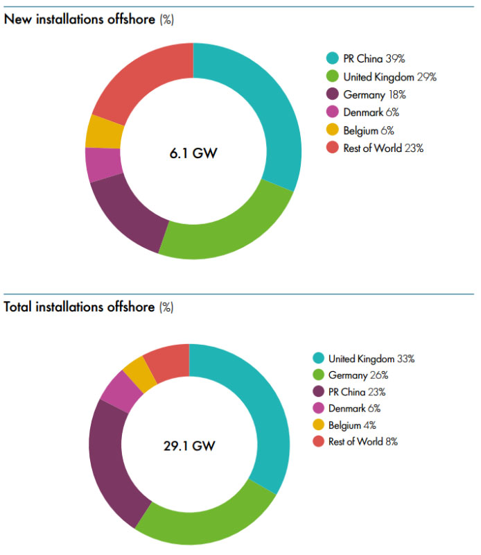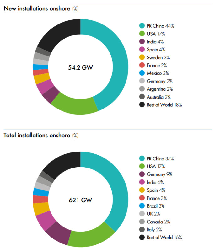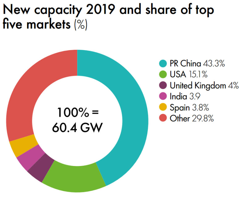 中國和美國仍是全球最大的陸上風(fēng)電市場,兩國合計占2019年新增裝機容量的60%以上。