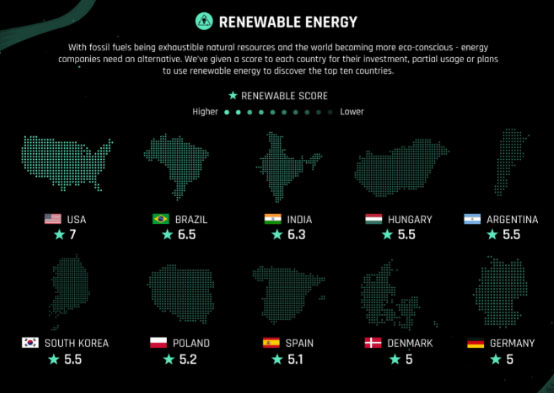 近日,英國(guó)商業(yè)能源在一項(xiàng)研究中,對(duì)29個(gè)國(guó)家從投資到可再生能源的使用情況進(jìn)行了評(píng)分,選出了前十名。其中,美國(guó)作為世界上最大的能源經(jīng)濟(jì)體以7分排名第一,巴西緊隨其后排名第二,得分為6.5分;印度排名第三,得分為6.3分;其余依次為匈牙利(5.5)、阿根廷(5.5)、韓國(guó)(5.5)、波蘭(5.2)、西班牙(5.1)、丹麥(5)、德國(guó)(5.5)。