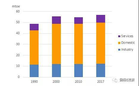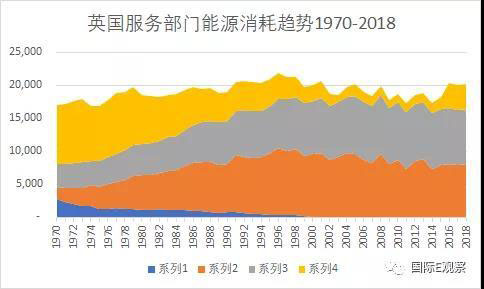 自1970年以來(lái),英國(guó)的服務(wù)部門(mén)能源消耗總量變化不大,但能源消耗的種類發(fā)生了變化,即煤炭消耗從1970年的較高比重,到2000年左右不再消耗煤炭。天然氣消耗和電力消耗成為主流,石油消耗比重不高。