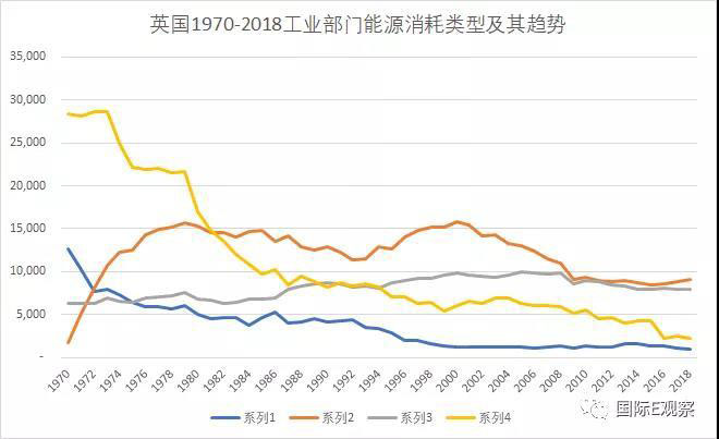 從上圖可以看出,隨著1970年代英國(guó)的去重工業(yè)化轉(zhuǎn)而集中發(fā)展金融、航空航天、生物科技等,工業(yè)部門(mén)所占比重大幅度下降。如今制造業(yè)所占比例約10%;但占科技研發(fā)投入的69%。隨著工業(yè)大規(guī)模轉(zhuǎn)移,工業(yè)部門(mén)能耗下降趨勢(shì)自然隨之而變化。