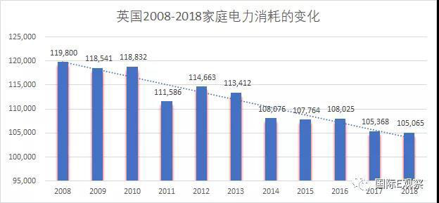 過(guò)去10年以來(lái),英國(guó)家庭能耗總體呈現(xiàn)下降趨勢(shì)。人均能耗電力消耗最高,為2008年的4630度電;2018年為最低3831度電。