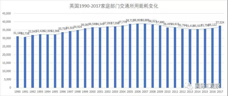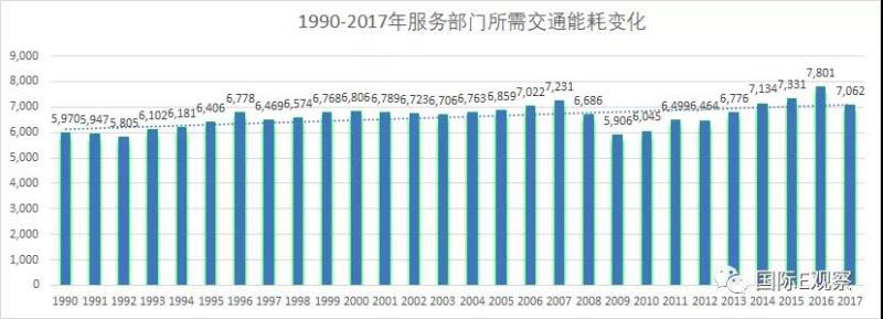 對(duì)于家庭部門(mén)所用交通的能耗,1990-2017年間呈現(xiàn)總量上升趨勢(shì),但相對(duì)平穩(wěn),最高為2006年的38903(百萬(wàn)噸油當(dāng)量);最低為1991年的30738(百萬(wàn)噸油當(dāng)量)。但家庭部門(mén)的交通能耗占比為最高,平均水平為65%。