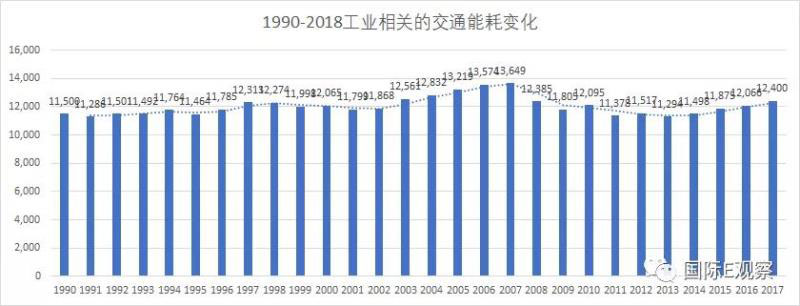 按照最終的能耗部門(mén)看,自1970年以來(lái)工業(yè)部門(mén)能耗比重在不斷下降,到2015-2016年則降至17%左右,2018年工業(yè)部門(mén)的能源消耗有所抬頭:交通部門(mén)一次能源消耗所作戰(zhàn)比重最高為40%,且仍然處于上升態(tài)勢(shì);其次為家庭用戶消耗,占比為29%;能耗也處于上升趨勢(shì),而服務(wù)業(yè)的能耗相對(duì)保持穩(wěn)定,所占比例為14%。