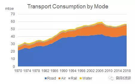 從上圖可以看出,過(guò)去48年來(lái)英國(guó)的交通部門(mén)能耗總量呈現(xiàn)上升態(tài)勢(shì),尤其以公路交通的能耗占比最大,其次為航空運(yùn)輸,再次為鐵路交通,最小的為水路運(yùn)輸。