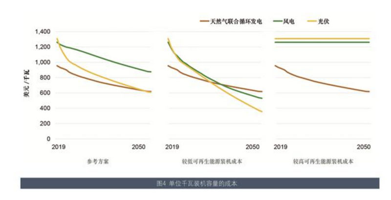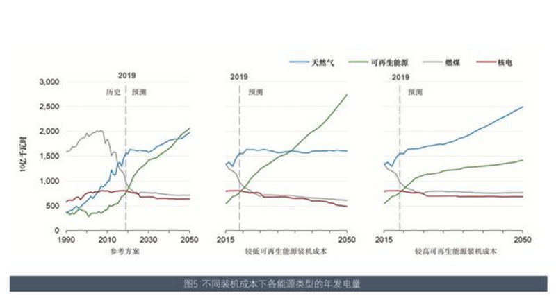 例如,技術(shù)成本變化所帶來的不同結(jié)果如圖4、圖5所示。由此可以看出,諸如成本和政策等因素為可再生能源帶來的影響仍舊會非常明顯。