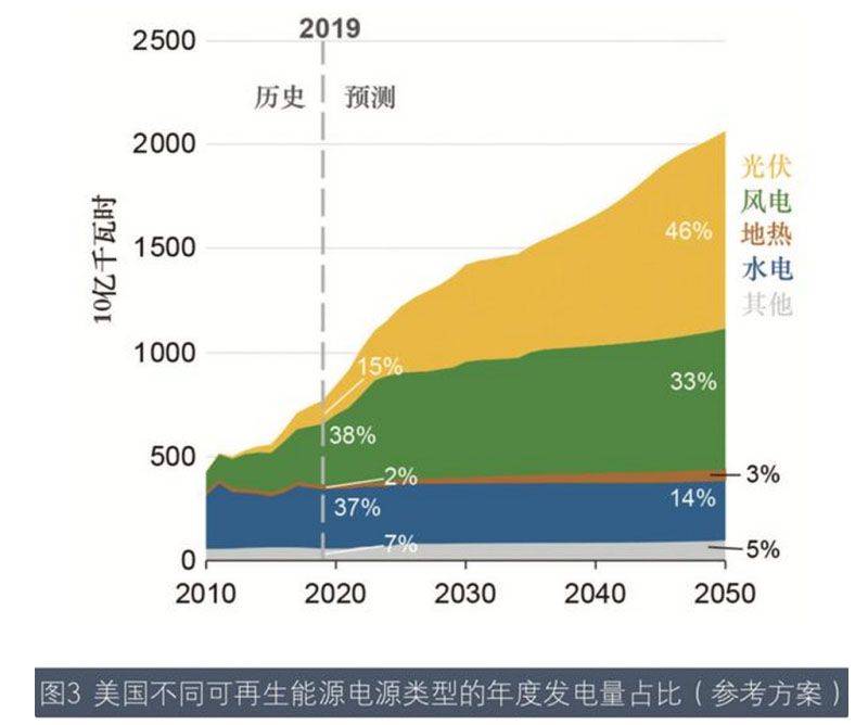 報告認為美國電力系統(tǒng)還將經(jīng)歷快速變化,在聯(lián)邦稅收抵免政策(PTC)和州級可再生能源目標的支持下,伴隨著風電和光伏成本的穩(wěn)步下降,到2050年,可再生能源將成為增速最快的電源。隨著電力負荷的緩慢增長和 可再生能源發(fā)電量的快速增加,美國燃煤和核電發(fā)電量將會下降。