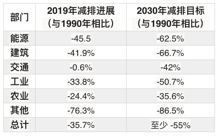 根據(jù)2019年的德國氣候行動法,以1990年為基準(zhǔn),2030年的減排目標(biāo)、2019年的進(jìn)展如下表所示: