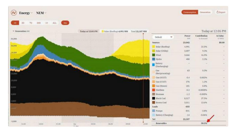 在上周西方復活節(jié)當天,澳大利亞可再生能源達到了電網(wǎng)需求的創(chuàng)紀錄水平,當時屋頂太陽能,大規(guī)模風能以及太陽能和水力發(fā)電的總產(chǎn)量達到凈負荷的50.4%。