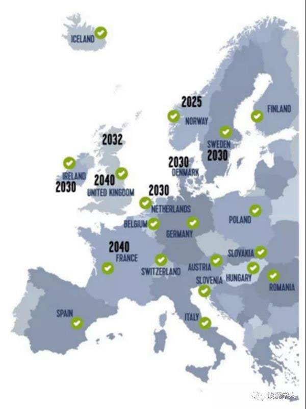 圖2. 計劃禁止(純粹)以汽油為動力的汽車進(jìn)行注冊(以年為單位)以及購買電動汽車具有補(bǔ)貼的歐洲國家/地區(qū)總體概覽(以綠色“對號√”表示)
