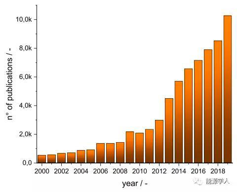 1. 科研&學(xué)術(shù)發(fā)展:如圖1,通過觀察2000年至2019年相關(guān)科學(xué)出版物數(shù)量的增加,也可以明顯地看出,關(guān)于鋰離子電池的學(xué)術(shù)研究工作在不斷增加,2019年已發(fā)表超過10000篇論文。而在同一時間范圍內(nèi),已提交了涉及鋰離子電池的發(fā)明專利也有10500多項(數(shù)據(jù)來源:Google Patents)。