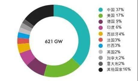 截至2019年底,全球陸上風(fēng)電累計裝機(jī)容量達(dá)到621 GW,位列前五位的國家分別為中國、美國、德國、印度和西班牙,共占全球市場的73%。