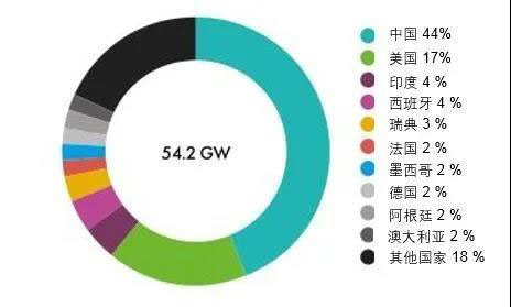 2019年,全球陸上風(fēng)電新增裝機(jī)容量為54.2 GW,排在前五名的國家分別為中國(23.8 GW)、美國(9.1 GW)、印度(2.4 GW)、西班牙(2.3 GW)和瑞典(1.6 GW),其他國家占比28%。