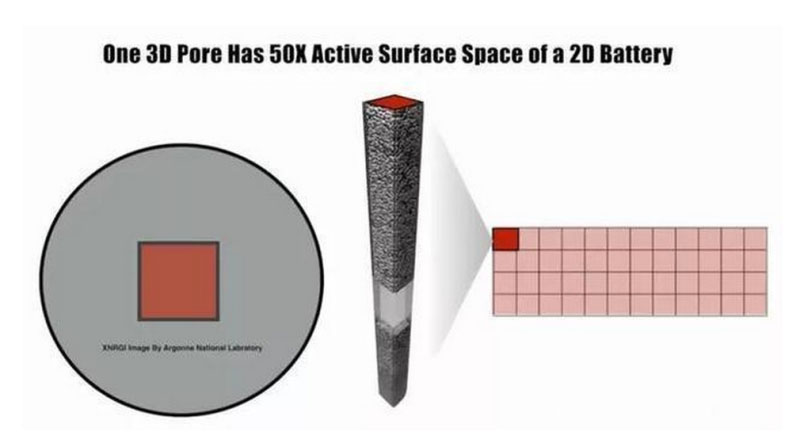 一個(gè)3D孔的活性表面空間是一個(gè)2D電池的50倍